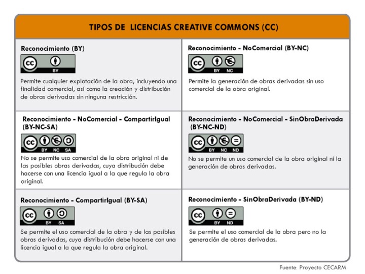 - (2011). «Tipos de licencias para contenidos digitales». Recuperado de https://www.cecarm.com/emprendedor/puesta-en-marcha/tipos-de-licencias-para-contenidos-digitales-32010